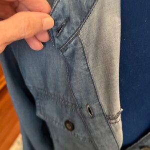 Elan long-sleeve dress in gently-used, like new condition, made of easy care, demin-look lyocell. Size Medium, oversized and may work as large. Unlined dress works great with laying turtleneck, t-shirt, leggings or jacket. Pockets too! Dress is 20" armpit to armpit and 33.5" in length. Make this beautiful dress yours today!