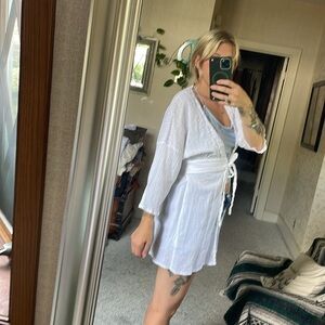 Experience comfort and elegance with this white lace trim swim cover by Elan. Perfect for layering over a bikini or outfit at the beach. Great pre loved condition size medium .