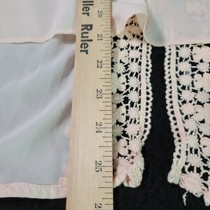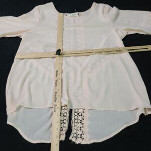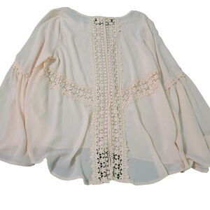 Elan Elegant Womens Sheer Blouse in Pink, size Medium, 100% Polyester with bell sleeves and lace back.