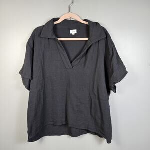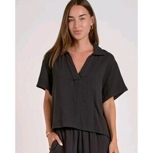Elan Gauze Blouse 100% Cotton Relaxed Short Sleeve Collared V Neck Shirt Popover