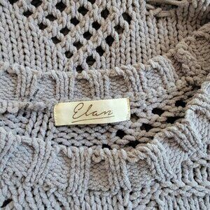 Love this look! It is by Elan in a size medium. The sweater is gray with cable knit. Long sleeves with hem endings with distressed knitting. The sweater has distressed pulls on the front and the back hemline. It has a scooped neckline. The front is shorter than the back. The sweater has a loose fit. My photos show a colored area at the distressed hems, however it is just the back of my mannequin.