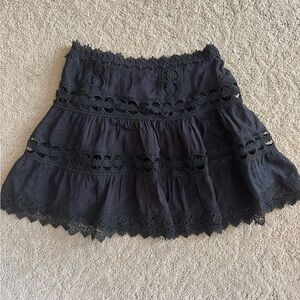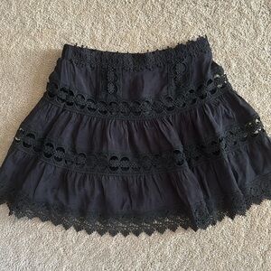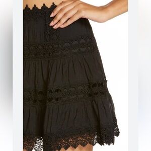 The perfect mini skirt does exist.This all black eyelet skirt starts with a high waist that flows to a flared skirt. Pull on construction with elastic in the back. Pair with the matching wrap top for the perfect resort cover up. Fit is true to size. Model is wearing a size XS. High Rise. Pull On. 50% viscose, 30% polyester, 20% polyamide. Lined. Lining - 100% polyester. Hand wash cold, lay flat to dry. Do not bleach. SIZE + FIT - Model is 5'9 wearing size XS. Measures 16" in length