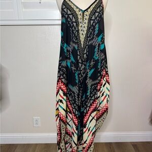Color: Multicolored, Santa Fe/Aztec/Southwestern Print, Sleeveless, Adjustable Spaghetti Straps, Genie/Parachute Legs, Oversized Fit, Cropped, 100% Polyester - Smoke Free Home.