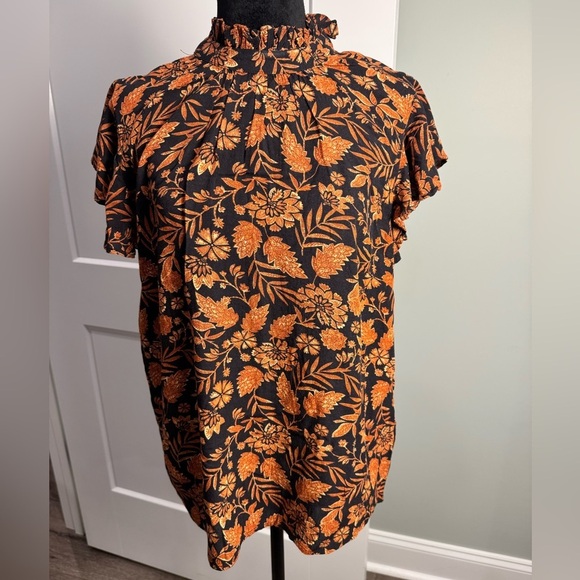 Elan NWT floral print mock neck flutter sleeve black and orange top
