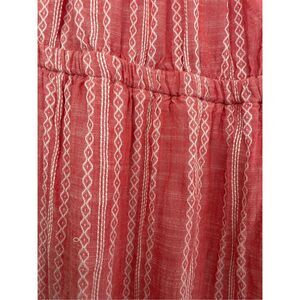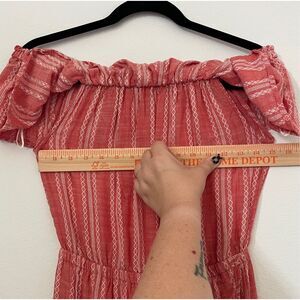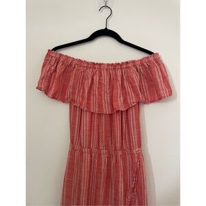 Flowy and feminine, this Elan off shoulder maxi dress features a ruffle neckline and boho-inspired pattern. Made from lightweight rayon, it has an elastic waist and a front slit for added movement and style. Perfect for beach vacations, casual summer days, or resort wear. Gently pre-owned and in great condition. Please see photos for measurements.