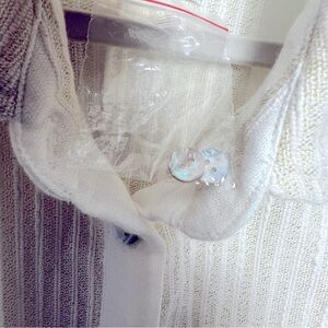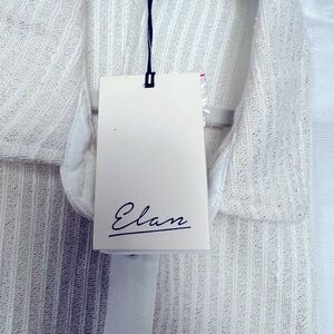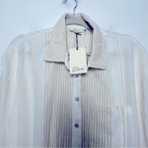 This Elan cover-up in a gauzy cotton with gold metallic threading in stripes. A relaxed fit, perfect for casual occasions weather on vacation at the beach or weekend summer fun. Made from a light, flowing fabric, it offers a polished yet comfortable look. Collard button down with a ruched waist tie ending in tassels. Can be pulled in or relaxed for different fitting. 1/2 length cuffed dolman sleeves and yes, pockets.