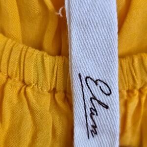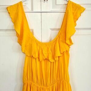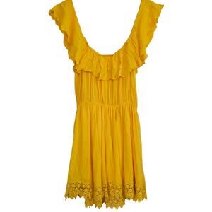 Elan yellow ruffle top festival dress. Can be worn off shoulder. Crochet bottom. Elastic waist.