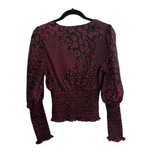 Elan Size S Burgundy Leopard Print Smocked Waist & Cuff Blouse V-Neck