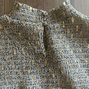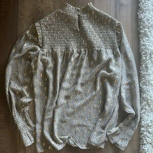 Long sleeve smocked high neck, Elan top with gold metallic flecks in the fabric. Silky feel and very lightweight.
