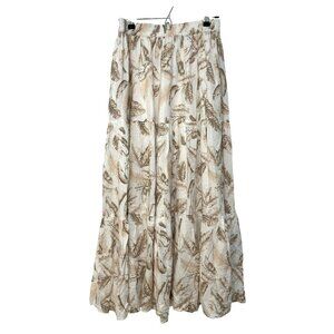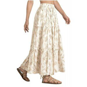 This tiered maxi skirt features a delicate feather print in neutral beige and brown tones. Its lightweight fabric and stretch waistband provide comfort and effortless elegance for daily wear.