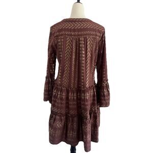 Elan Tiered Dress Womens Medium Brown Gold Babydoll Bell Sleeves Pull Over Boho