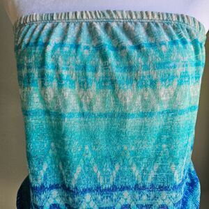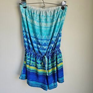 Perfect for summer. Can be daily wear or a swimsuit coverup. Strapless romper with elastic around the bandeau neckline and waist. Pretty blue and green color in a breezy lightweight knit fabric.