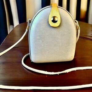 Elan Vintage faux ivory leather hard shell case clutch or shoulder bag. Magnetic clasp. One back open pocket. The strap can be hidden inside purse. The color is in the beige/ivory family.