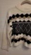 Cozy crew neck sweater by Elan. Features a striking black and tan geometric pattern on a white base. Perfect for casual wear.