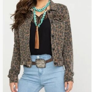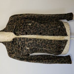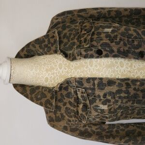 Elan Woman's Leopard Print Button Down Button Cuff Collared Chest & Side Slit Pockets Distressed Denim Jacket Size S Spring Chic Girlcore NWT Reasonable Offers Welcome