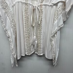 Elan women's bohemian top in light cream. Armholes. Tie front with tassel details. Embroidered. Side slits. Gauzy fabric. In good used condition. No stains, tears or holes.