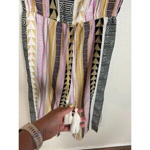 Elan Women's Jumpsuit in a cropped style, strapless, size medium, features a unique black, pink, and tan striped design with geometric accents. New with tags. Made from a comfortable blend of cotton and polyester. Pull-on closure, elastic waist, and tasseled accents add a stylish touch to this colorful and boho-themed garment. Machine washable. Size medium.