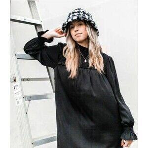 This Elan Women's Black Mini Dress in size M features a mock neck, sheer chiffon fabric, and ruffle accents. The dress has a button closure, long balloon sleeves, and a smocked design, making it lightweight and perfect for summer, fall, or spring occasions. With a trapeze & swing style, this edgy and sexy dress is great for parties or nights out, adding a touch of romance and sophistication to your outfit. Perfect for those looking for a flowy and unique dress to make a statement.