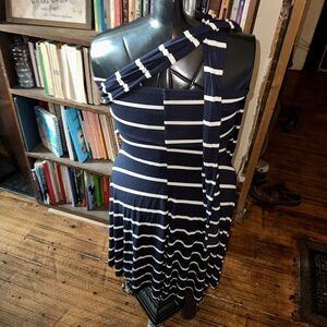 Elan navy and white striped, knit, convertible maxi skirt/dress. Great for summer days and vacations. In good, used condition. Approximately 13 inches across the top, 15 inches across the bottom of the van, and 36 inches long. From a pet and smoke free house.
