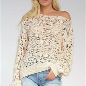 Elan crochet knit off the shoulder sweater. Lightweight sheer summer boho