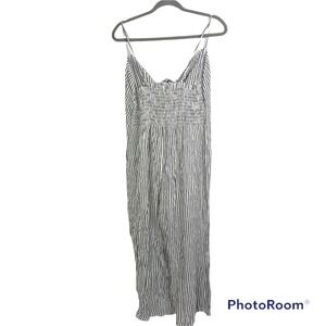 Brand new Elan striped jumpsuit. White and grey stripes. Tie front bust with keyhole. Adjustable spaghetti straps. Smocked stretch back panel. Wide leg.
