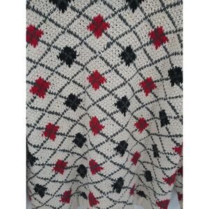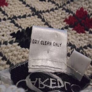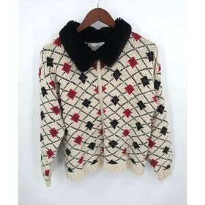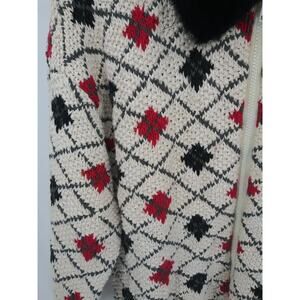 Elana Carello Cream Diamond Print Zip Front Faux Fur Collar Grandma Cardigan Med