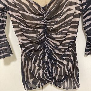 Elana Kattan Zebra print tulle top with sweetheart neckline, ruched center front, 3/4 length sheer sleeve, raw hem and nude lining.