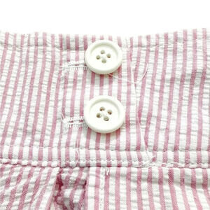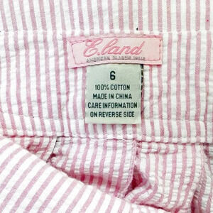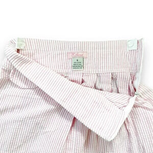 Girl’s pink seersucker skirt from E. land. Double button/side zipper closure; faux front pockets; all-around pleats.