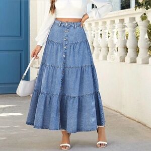 Elastic High Waisted A Line Long Denim Skirt Button Ruffle Tiered Jean pocket
