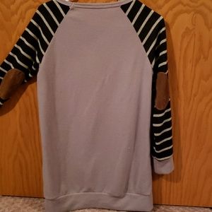 This is a trendy sweater with striped sleeves and elbow patch detail.