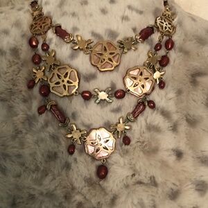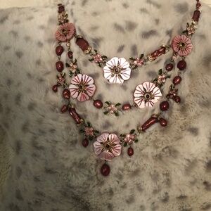 Beautiful Eye catching bib Necklace in pink flowers and pink stones with gold detail as well Necklace is adjustable. Pics are included for the back also. Very feminine and eye catching great for a dressy event 😊