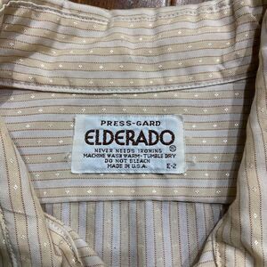 Make a statement with this pre-owned Elderado Vintage 70s Casual Button Down Shirt in men's size XL! The classic beige and white striped pattern exudes retro charm, making it a must-have for any fashion-forward individual. With long sleeves for added warmth and a great condition that speaks to its quality, this shirt is sure to become a staple in your wardrobe.