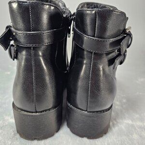 The Elditas Women's Black Ankle Booties in size 9M are stylish and versatile, perfect for various occasions including travel, parties, casual outings, and workwear. Featuring an almond toe shape, low block heel, and side zip closure with buckle accents, these booties offer comfort and easy wear. Made with synthetic outsole material and textile/synthetic lining, these black booties from the Shelly model by Elditas are designed for year-round wear and add a touch of edgy biker style to any outfit. Perfect for women looking for a chic and fashionable footwear option.