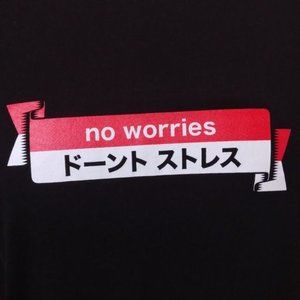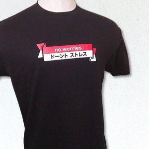 Eldon No Worries tee. "No Worries" with kanji script screened on the front. Short sleeve. Crew neck. 100% cotton. Machine wash. Made in USA. This item is new without tags (NWOT) Excellent condition. Men's Large.