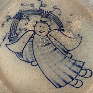 Beautiful salt glazed pottery pie plate with an Angel floating in the center. Great vintage pre-owned condition, no chips or cracks.