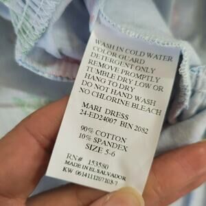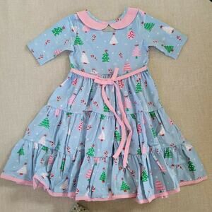 Eleanor Rose Candy Cane Lane Candy Trees Mari Dress. Blue with pink collar and trim. Candy cane and tree print. Ties on back. New without tags. Removed from packaging to photograph only. Size 5-6 years.