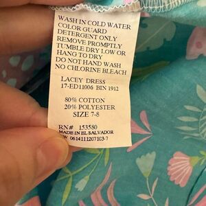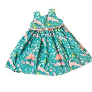 Sleeveless sundress with floral and dinosaur print. Teal blue green and pink. Button closure in back. Hidden side seam pockets. Ruffle around bodice. Dino.