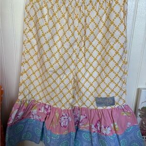 Charming Eleanor Rose dress with yellow stripes and pink floral pattern. Comes with matching pants featuring a yellow geometric design.