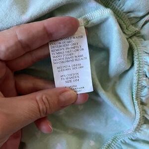 Eleanor Rose twirl dress, green with pink polka dots. 18 months