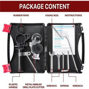 🧿【PACKAGE CONTENT】:The tool box contains an electric drill plate cutter (electric drill is not included), a manual, an Allen wrench, two wrenches of different sizes, a connecting rod, a spring for fixing, a plastic handle and its buffer rubber ring. All the tools you need are here.