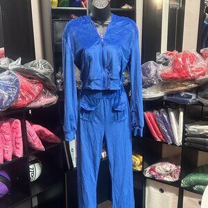 Elevate your casual wardrobe with this vibrant blue velour tracksuit, perfect for both lounging and stepping out in style.