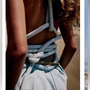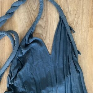 Soft cotton beautiful blue jumpsuit. Open back and rope tie. Image with model is same style but not the same fabric. It’s in good condition but has some slight ware.