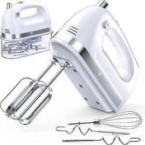 Features: This powerful 400W hand mixer comes with stainless steel attachments including whisk, beaters, and dough hooks, all stored conveniently in a compact box. It has 5 adjustable speeds to handle everything from whipping cream to kneading dough. The dishwasher-safe attachments make cleanup a breeze, and the ergonomic round handle offers comfortable control. Ideal for baking enthusiasts and professionals alike.