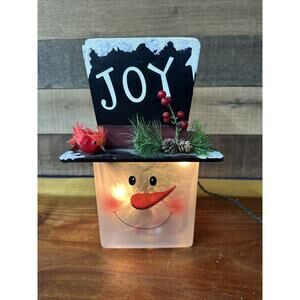 Electric Lighted Glass Snowman Centerpiece JOY 9” tall 7x7. Please ask any questions amd check out my other items. Have a joyful day -main shelf