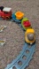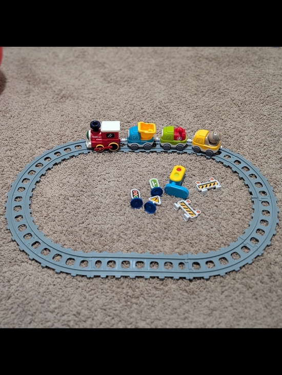 The set is similar to the one in the second picture except it's missing one sign and has a traffic light thing. Fill it with a bit of water to create steam. Plays music also. The little pieces move also on the last 3 pieces.