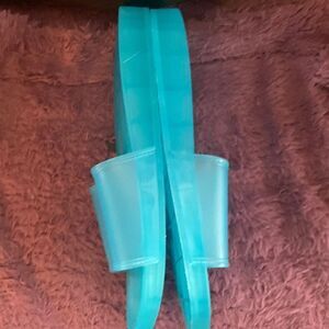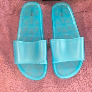 A pair of PVC slide sandals featuring a wide vamp strap, open toe, low platform sole, and slip-on styling.