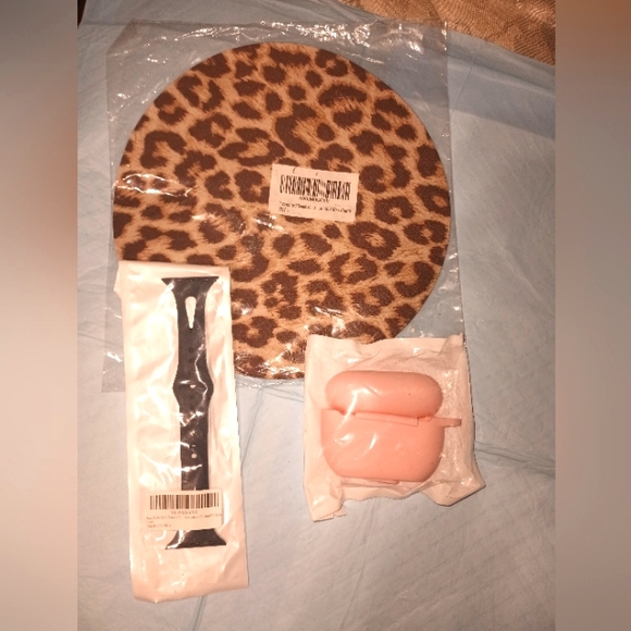 Leopard print mouse pad, pink silicon headphone case, and a pair black smart watch bands