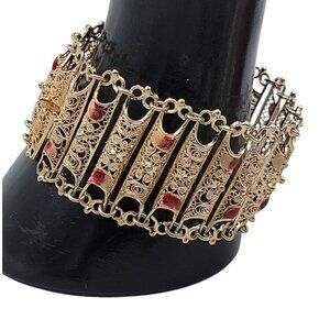 Electroplated Gold on 800 Silver Filigree Panel Bracelet Red White Accents 7.25"