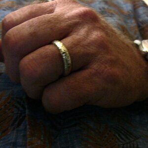 Mixing 70% of pure gold and 30% of pure silver, rolling the metal for strength and arc welding it into that unique natural pattern. Hypoallergenic (no solder or other metals used).