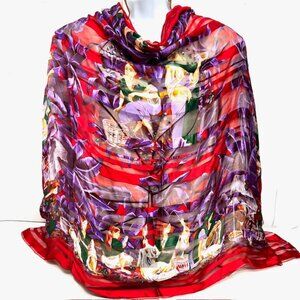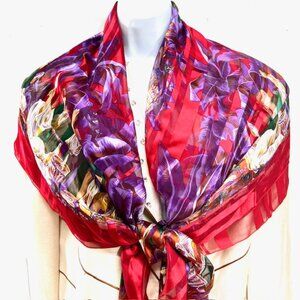 Elegance S.A PARIS (EE) please see the picture) Estée Lauder scarf is a luxurious addition to any wardrobe, featuring a beautiful red purple brown white greenfloral with women French pattern on 100% silk chiffon satin. Measuring 44 inches by 44 inches, , fabrique from France , made in France.